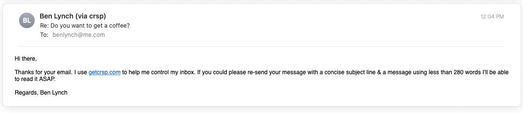 I’ve set some generic rules, protocols & processes that must be followed before an email can actually reach by inbox. This solves for the “imbalance of power” I mentioned above. Your email must be plain text, have a concise subject line and be less than 280 words, otherwise, it will be returned to you explaining the rules. Why 280 words? Twitter is 280 characters, 280 words feels about right for this medium. No point in overthinking it.